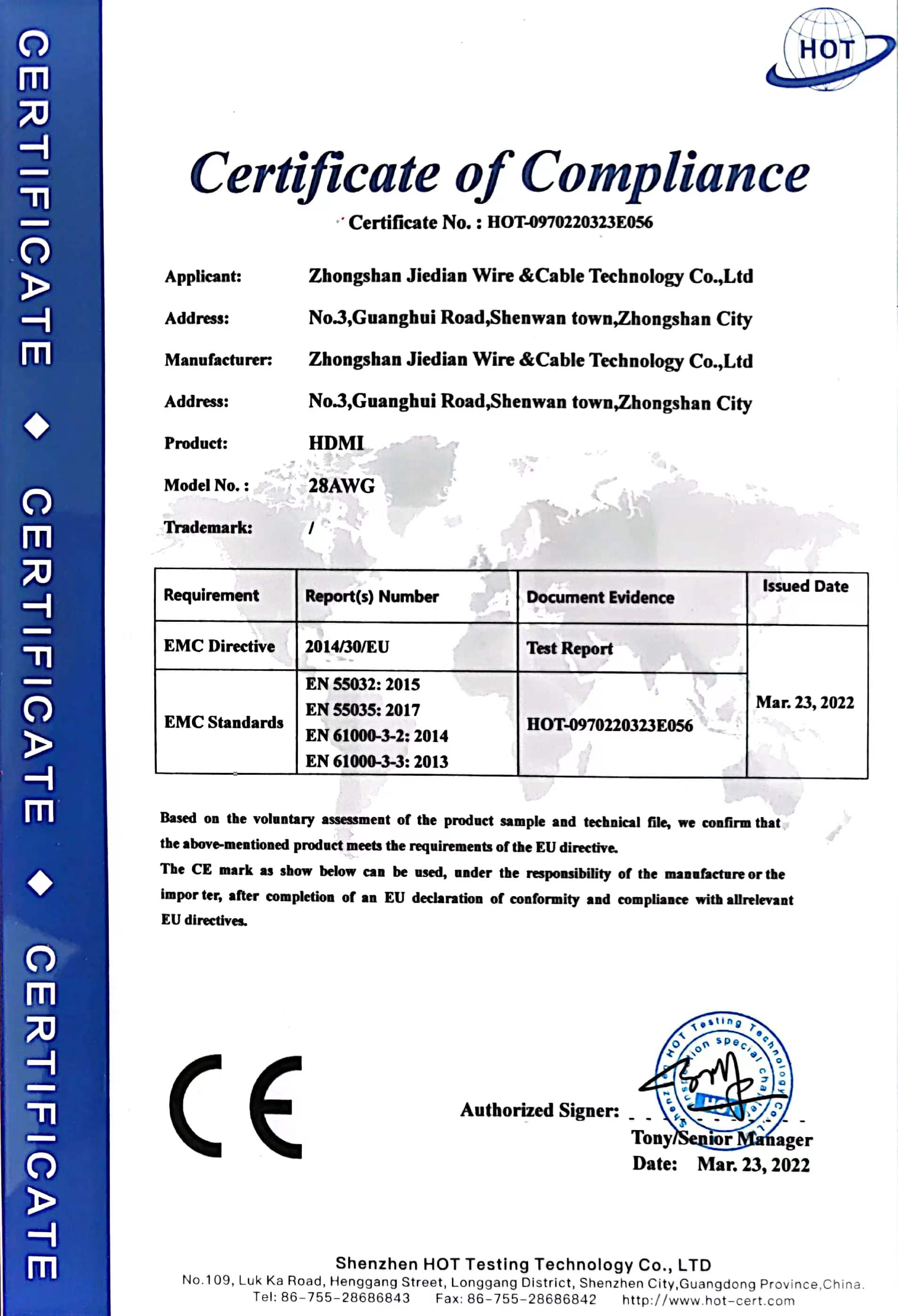 中山捷電線纜科技有限公司成立于2018年1月,注冊資本為480萬元人民幣,注冊地址為中山市神灣鎮外沙村光輝路3號第3層,是一家專業從事研發、生產、加工、銷售電線和電纜的企業。目前的主要產品為HDMI高清線、DVI線、VGA線、DP線、USB線、網絡線、音頻線等。擁有自己獨立的知識產權。經過ISO90001質量管理體系認證、HDMI協會認證、UL認證。公司成立以來,不斷進行市場開拓,同時注重提升服務質量,經這這幾年來的發展,已經成為一家初具規模的企業,目前還在不斷發展壯大中。